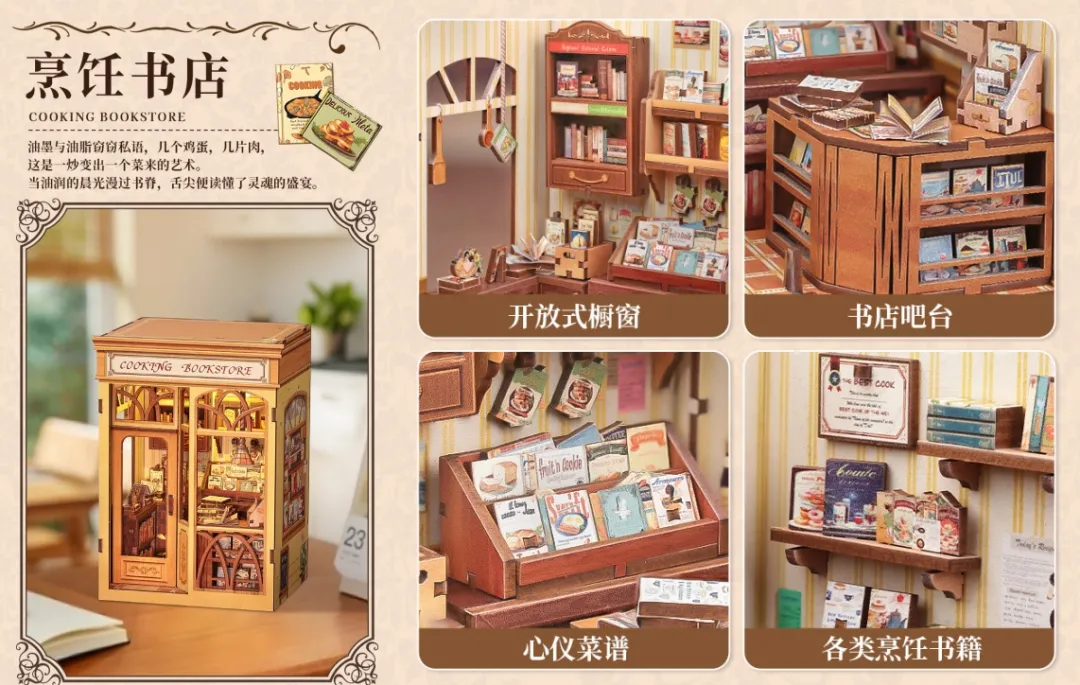 以书店书籍分类为灵感,包含了:烹饪书店,文学书馆,知域书店和缪斯书店。产品用微缩景观的细节制造惊喜,如蝴蝶标本墙、教材书架、期刊展示区、收银台、窗帘等等模块。卡口易拼,可做书立、居家装饰摆件。适配创意礼赠、居家装饰、收藏展示、亲子互动,手工DIY场景。