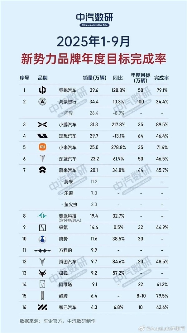 2025年10月6日,中汽数研近期公布了国内新势力汽车品牌在1至9月期间的年度销量目标完成情况。