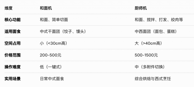 如果菜单以中式面点为主,厨房空间紧凑,预算有限,和面机是首选——它让烹饪回归本质,省时省心。若热爱烘焙实验,或家庭成员口味多元,厨师机将带来无限惊喜。选购时,优先试用操作感,关注功率与容量匹配家庭规模。