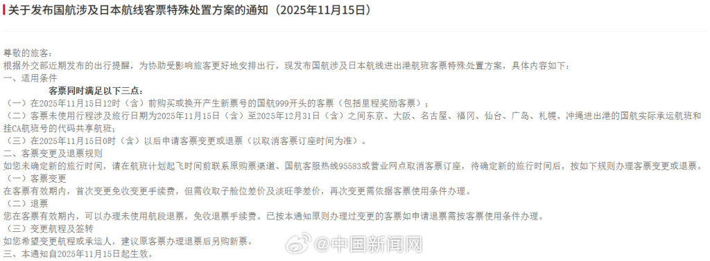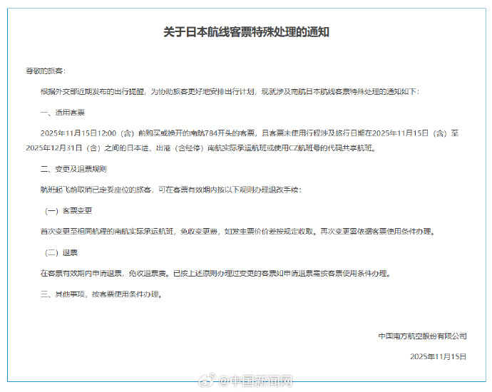 15日,中国南方航空股份有限公司发布《关于日本航线客票特殊处理的通知》,中国国际航空股份有限公司发布《关于发布国航涉及日本航线客票特殊处置方案的通知》,中国东方航空股份有限公司发布《关于日本相关航线客票特殊处理的通告》。