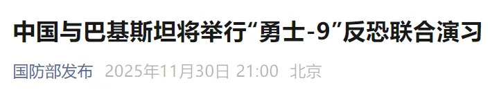 11月下旬至12月中旬,中国人民解放军西部战区和巴基斯坦陆军部队将在巴境内开展“勇士-9”反恐联合演习,以“联合反恐清剿打击行动”为课题,检验提升两军联合反恐能力,共同维护地区和平稳定。