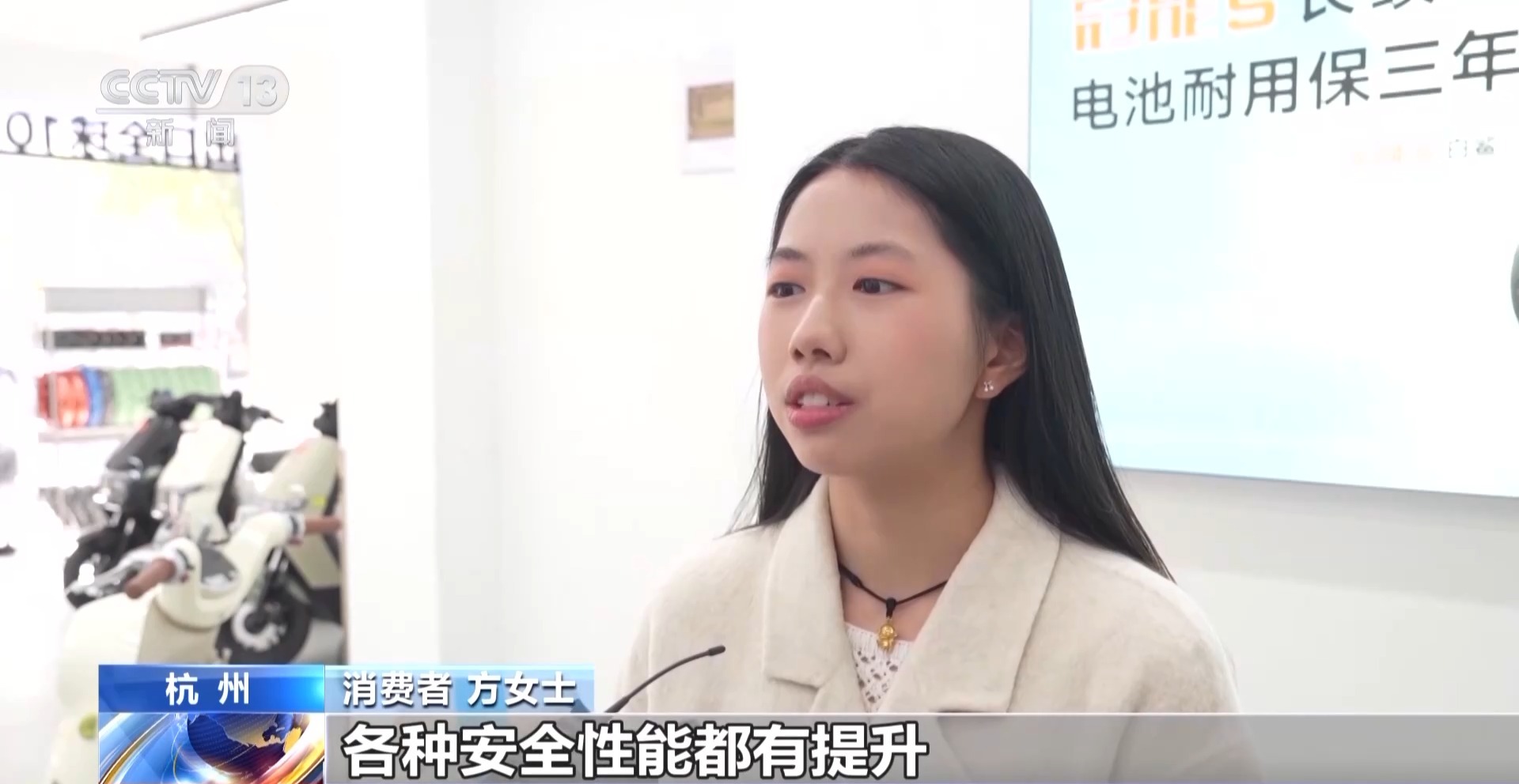 消费者 方女士:新国标相对于旧国标,各种安全性能都有提升,上路也会相对更加安全,我也会更加放心。