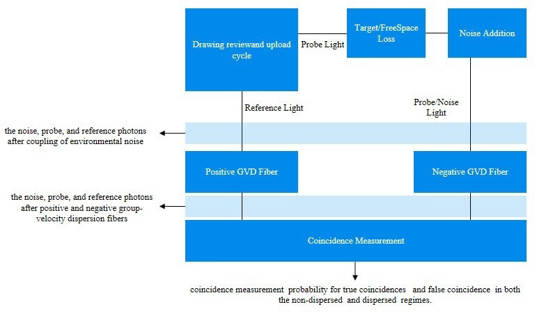 微云全息首先通过飞秒泵浦自发参数下转换(SPDC)产生非经典的时间相关光子对。其中,探针光子被发射到环境中,参考光子则在本地存储。探针光子在传播至目标及返回过程中会产生损耗,导致探针光束中的预期光子数减少。在传播过程中,环境噪声会耦合到探针路径中。若噪声与探针光子具有相同的光谱 / 时间分布,对探针 / 噪声光子施加异常色散,这将拓宽探针 / 噪声光子的时间分布,降低在有限时间窗口内检测到光子的概率。同时,对参考光子施加等量的正态色散,同样拓宽其时间分布。随后在两条路径上进行符合测量。由于探针和参考光子间的量子相关性,色散影响相互抵消,符合测量结果如同光子未被色散。利用纠缠光子的非局域色散消除了色散影响。相反,噪声和参考光子仅存在经典相关性,色散效应导致符合峰变宽。通过选择合适的时间窗口,可降低测量噪声光子与参考光子间假符合的概率,而测量探针光子与参考光子间真实符合的概率基本不变,从而实现更高的精度。