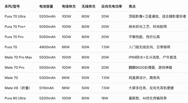 从表中可见,Pura 70系列的反向功率最高达20W,能在30分钟内为iPhone补充20%电量,而入门款如Pura 70则以7.5W稳扎稳打。折叠屏如Mate X6虽功率较低,但其大电池更适合长时间输出。选购时,建议优先Pura 70 Pro以上型号,它们不仅支持更高功率,还兼容HarmonyOS 5.0的AI充电管理,能根据场景自动优化(如夜间低功率模式,减少发热)。