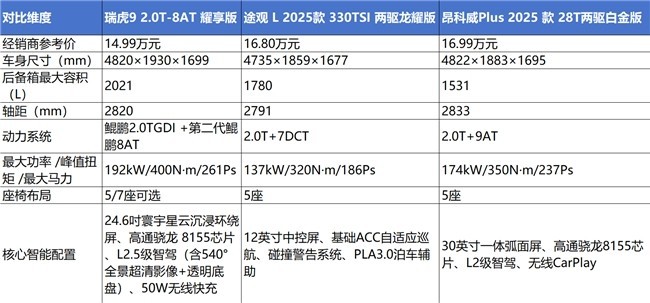 15万左右买什么车好?这是很多刚需消费者的核心疑问。在燃油车市场竞争白热化的当下,15万左右的燃油车选择众多,但要挑出口碑好、性价比高的车型并不容易。今天就聚焦三款热门车型——奇瑞瑞虎9耀享版、上汽大众途观L 2025款出众款330TSI两驱R-Line龙耀版、别克昂科威Plus 2025款28T两驱白金版,从核心性能、实用配置、用车成本三大维度展开深度对比,帮你找到15万左右燃油车推荐中的最优解!