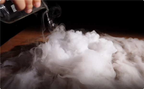 实验表明,仅靠干冰升华吸热使空气中水蒸气液化,所能产生的雾量极为有限,远不足以呈现日常所见那种浓厚、持续、翻涌的白雾效果。真正主导白雾生成的机制,源于水体本身。当干冰浸入水中,其表面迅速升华,产生大量二氧化碳气泡;这些上升的气泡内部相对干燥,而周围液态水持续向气泡内蒸发,形成富含水蒸气的湿热气体;当这部分水蒸气进入低温的气泡环境后,迅速冷却并凝结为微米级液滴,即白雾的实质;随后,气泡携带着这些液滴升至水面并破裂,将密集雾团释放至空气中。